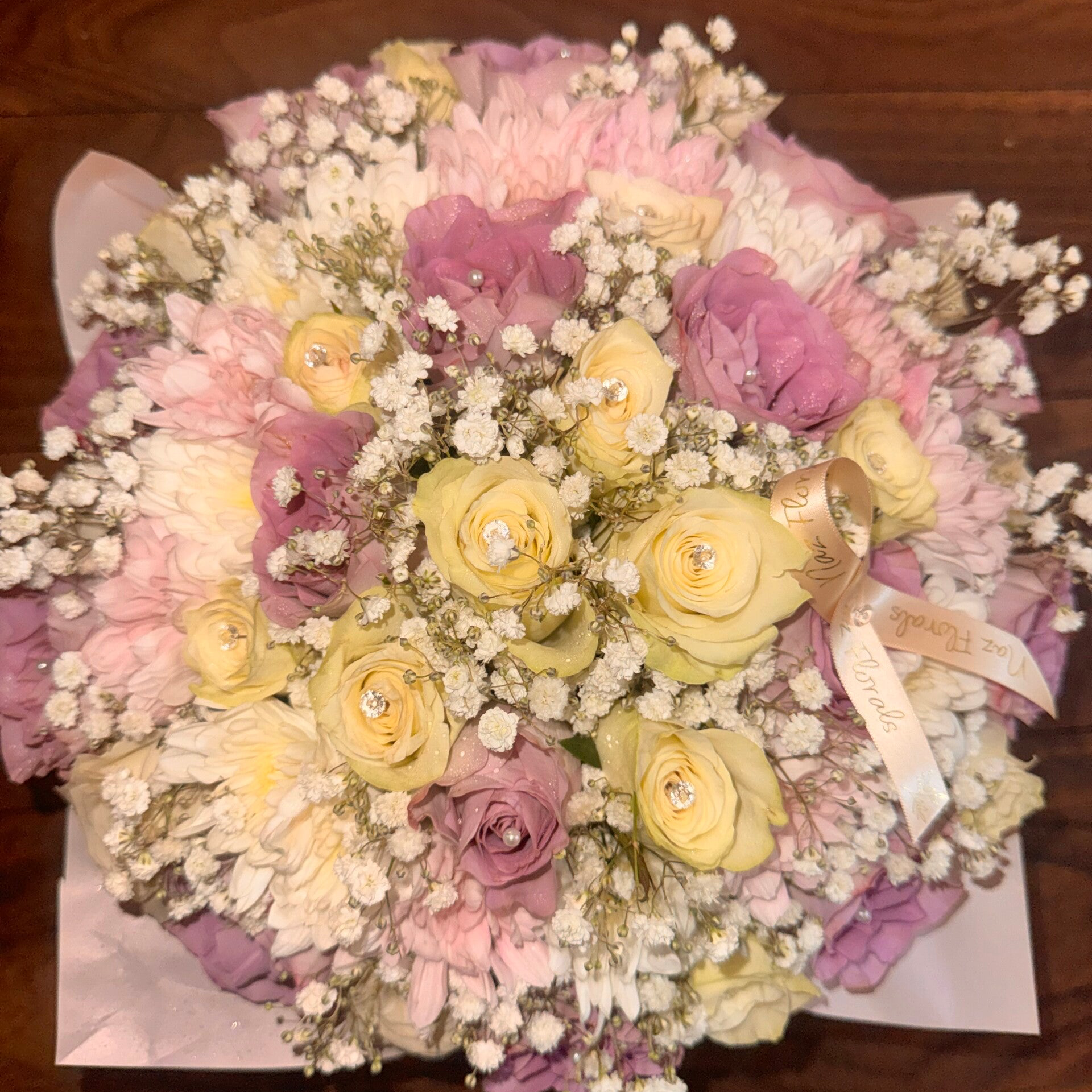 A soft and romantic bouquet bucket designed with delicate pastel tones and timeless elegance. Featuring a beautiful blend of cream roses, blush pink roses and soft pink chrysanthemums, this arrangement is gently accented with airy gypsophila (baby’s breath) for a light, graceful finish.